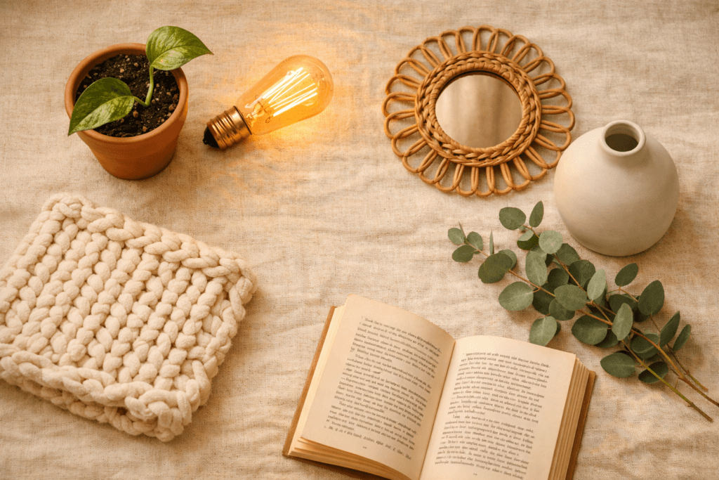 You do not need a whole room. A reading corner with a comfortable chair, a good lamp, a small side table, and a throw blanket works perfectly. The key is that this space serves only one purpose: your comfort and recovery.
